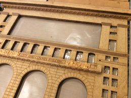 When the buildings were assembled, the final moldings, stairs, and planters were added, along with the trees, wreaths, snow, and sidewalks to create a magical holiday feel. Then it was time to turn the lights on and transport the buildings carefully to their new home in time for Light Up Night!