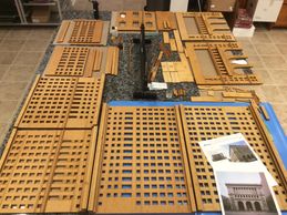 Pictured is one of the finished panels after etching and cutting all the details. Due to the large number of openings and the overall size of the gingerbread, special care was needed to handle the panels before the sugar windows were poured which added structural support to the panels. Some of the panels measured over 22" in length and 15" in height.